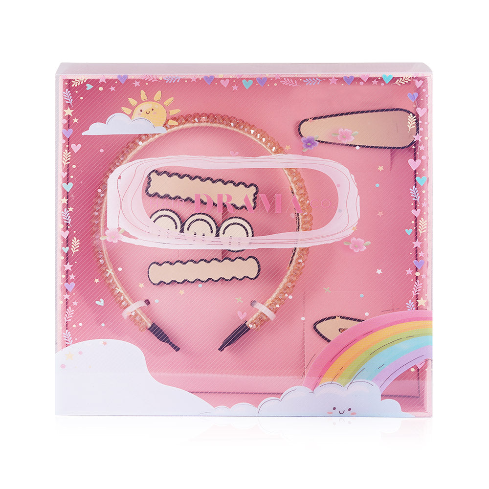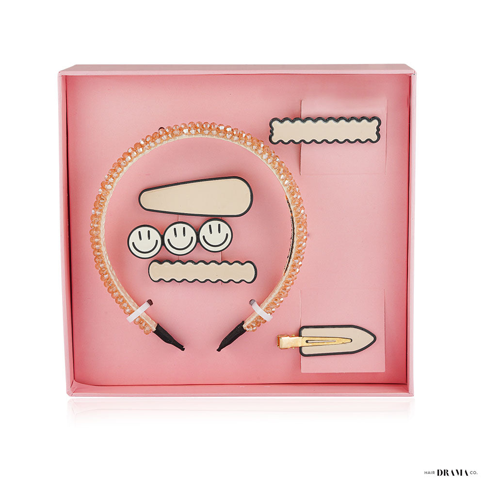 This is our Party themed Gift Box which contains 1 Beaded Hair Band in biege color and 5 Hair Pins. All of this comes in a giftable box!