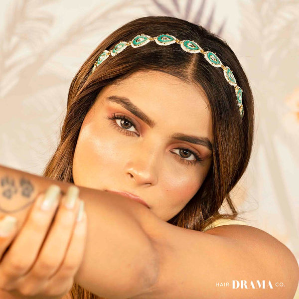 A must-have piece of hair jewelry in your wardrobe is a gold-plated sheesh patti, and there’s nothing better and more versatile than one studded with white polki and an intricate design. Grab your hairband on our site today.