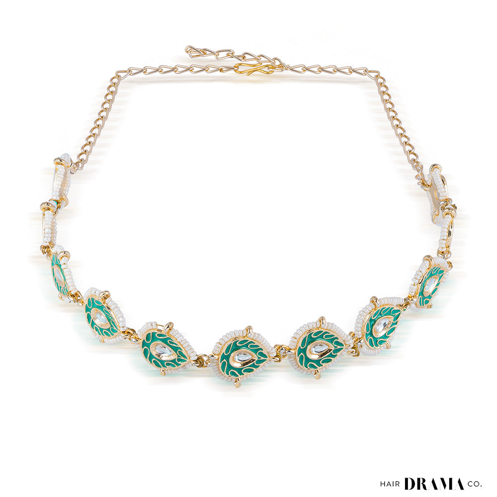 Gold-PlatedWhite Kundan & Polki Head Chain - Turquoise Green