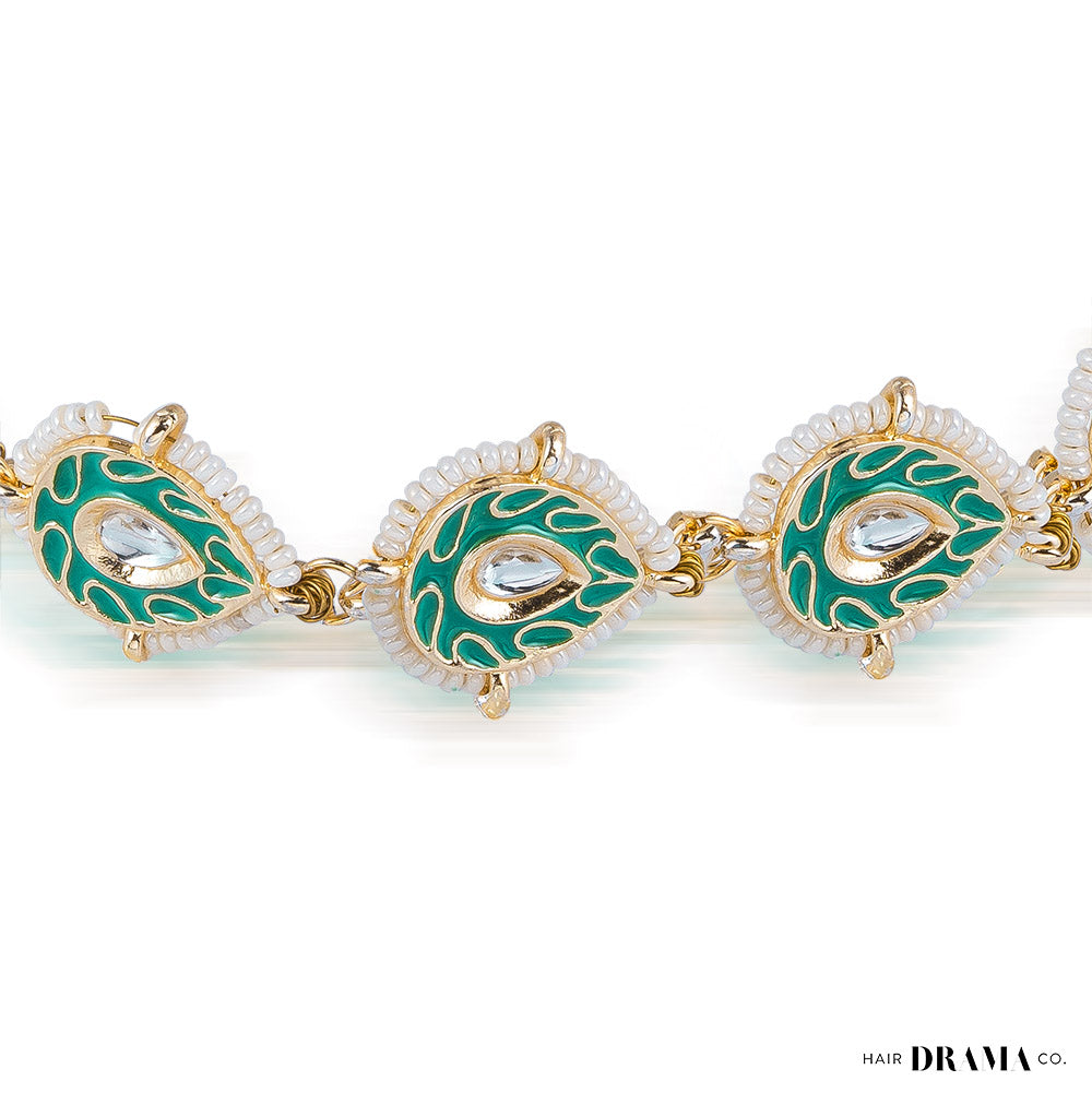 Gold-Plated White Kundan & Polki Head Chain - Turquoise Green