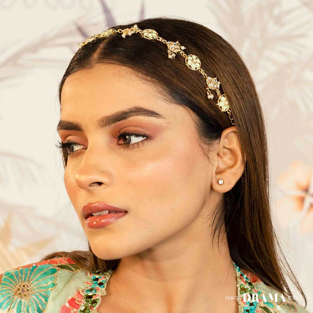 - Mint Green is the color of the season, and what’s a better way to add it to your look than a studded sheesh patti? Pair this beautiful hair jewelry with your Anarkali suit or dhoti outfit and rock the event as the diva you are!