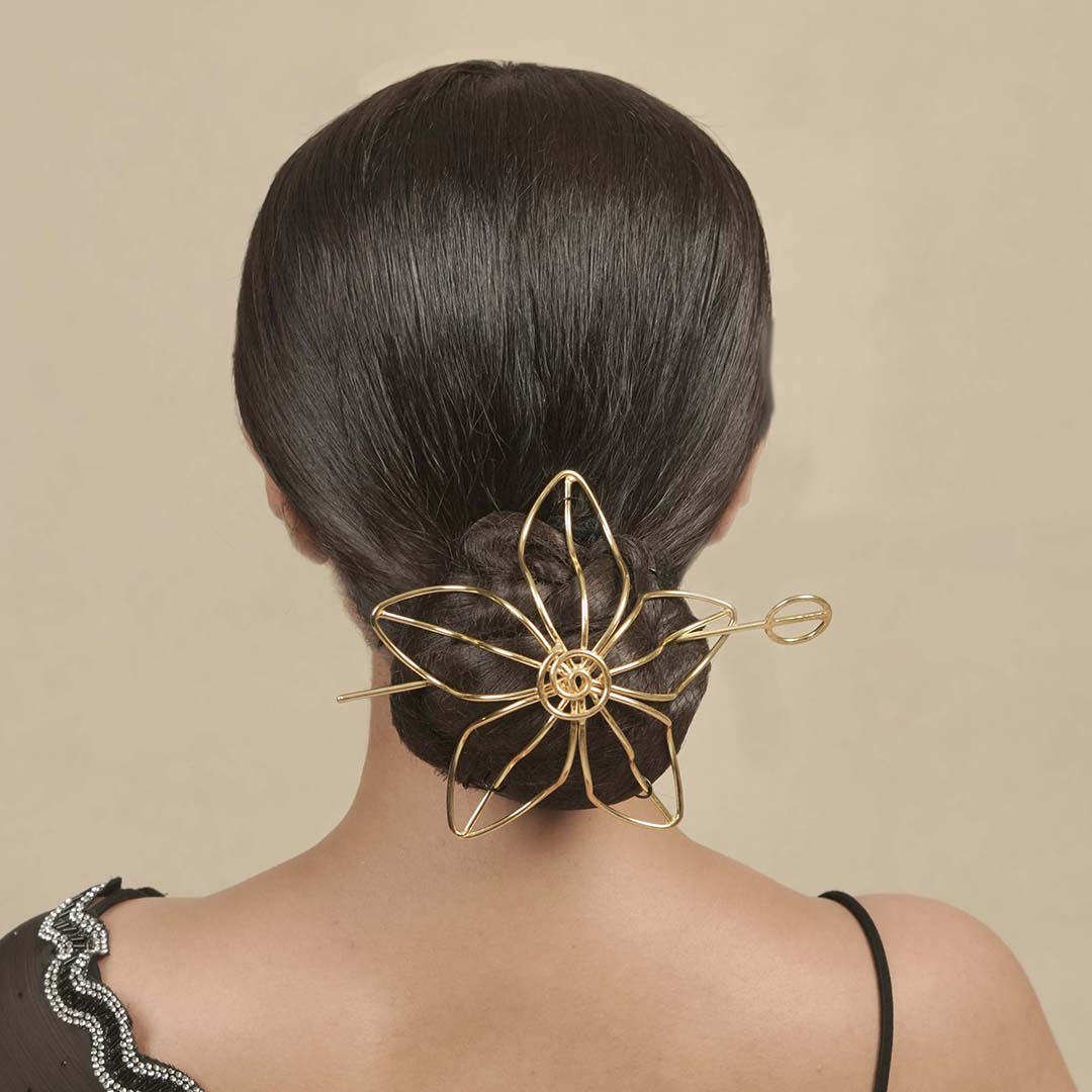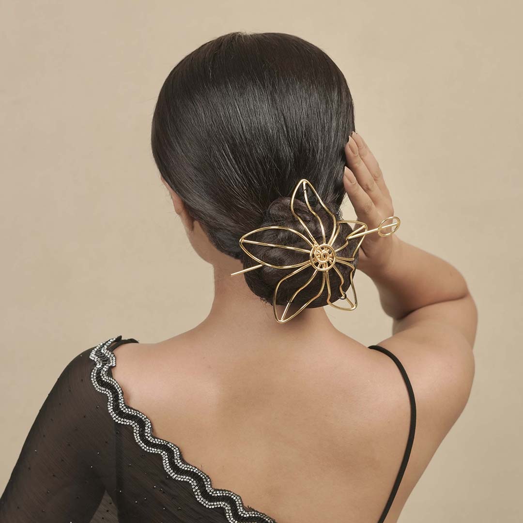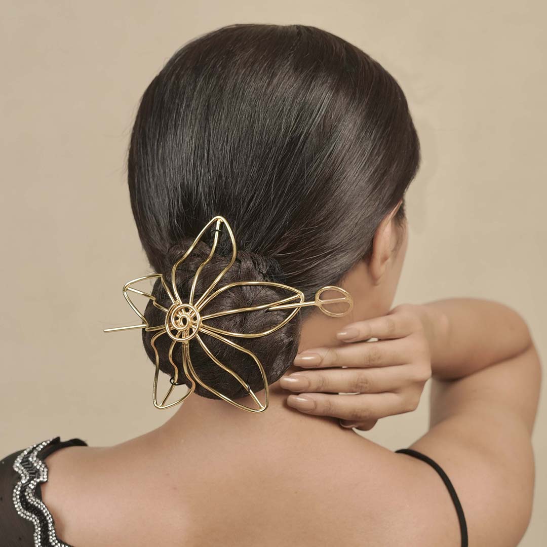 The design wraps around your bun like a cuff, with the stick sliding through to lock it in — no pins, no fuss. Whether you're styling a low sleek bun or a twisted updo, this juda holder blends tradition with a modern edge, making it perfect for everything from intimate weddings to celebratory evenings.