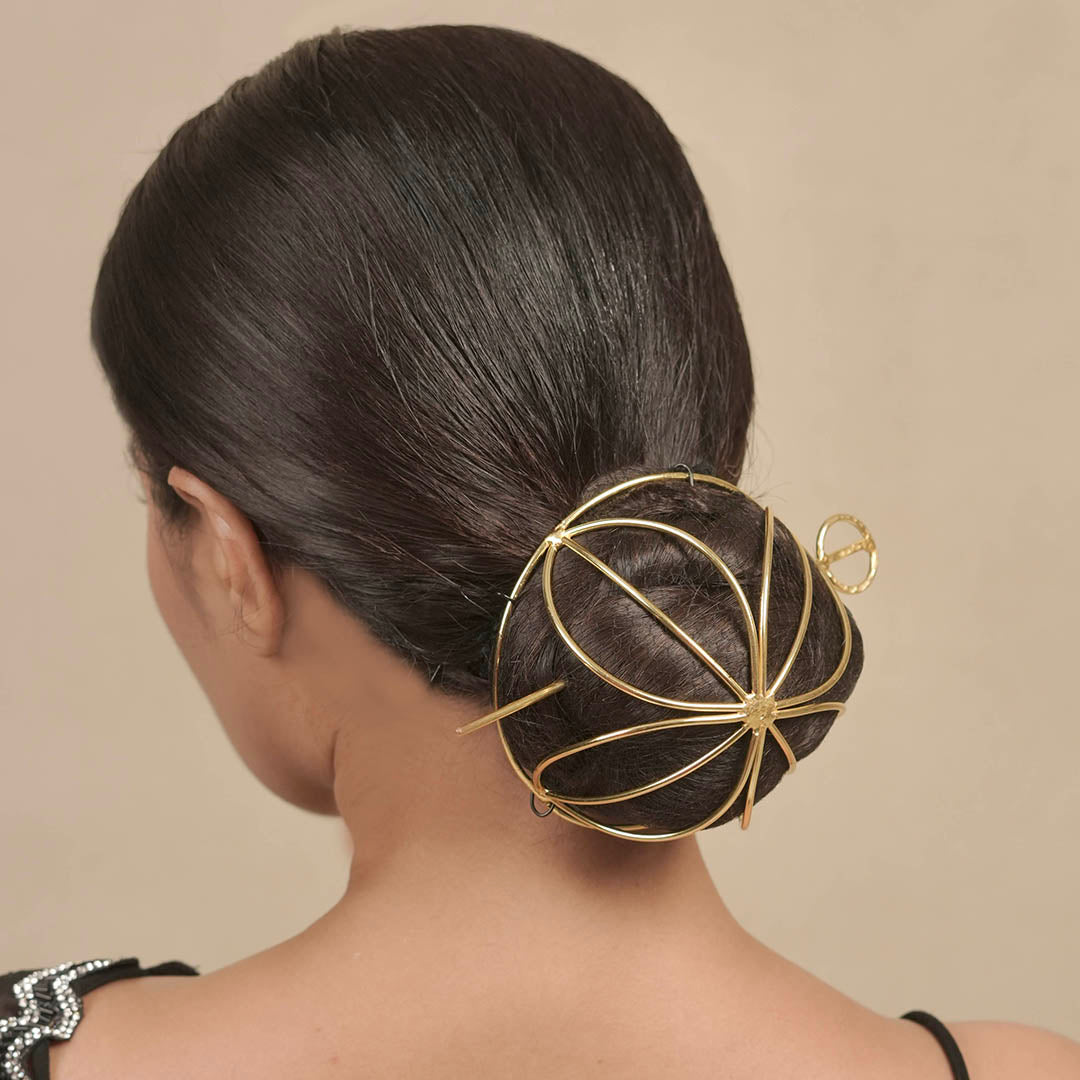 The design wraps around your bun like a cuff, with the stick sliding through to lock it in — no pins, no fuss. Whether you're styling a low sleek bun or a twisted updo, this juda holder blends tradition with a modern edge, making it perfect for everything from intimate weddings to celebratory evenings.