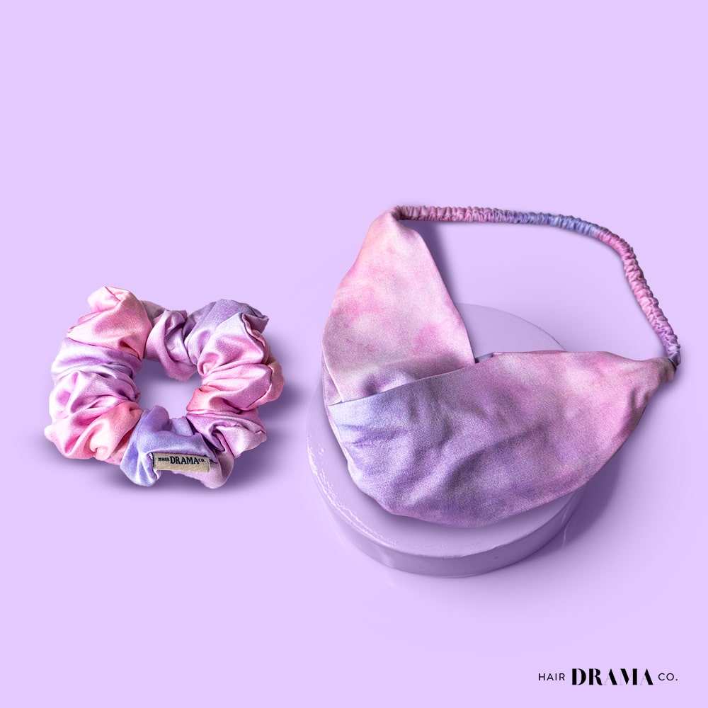 Buy this amazing and stylish Tie-Dye Cross-Knot Stretch Headband & Scrunchie Set - Pink & Lilac. This set includes a knot turban and scrunchie