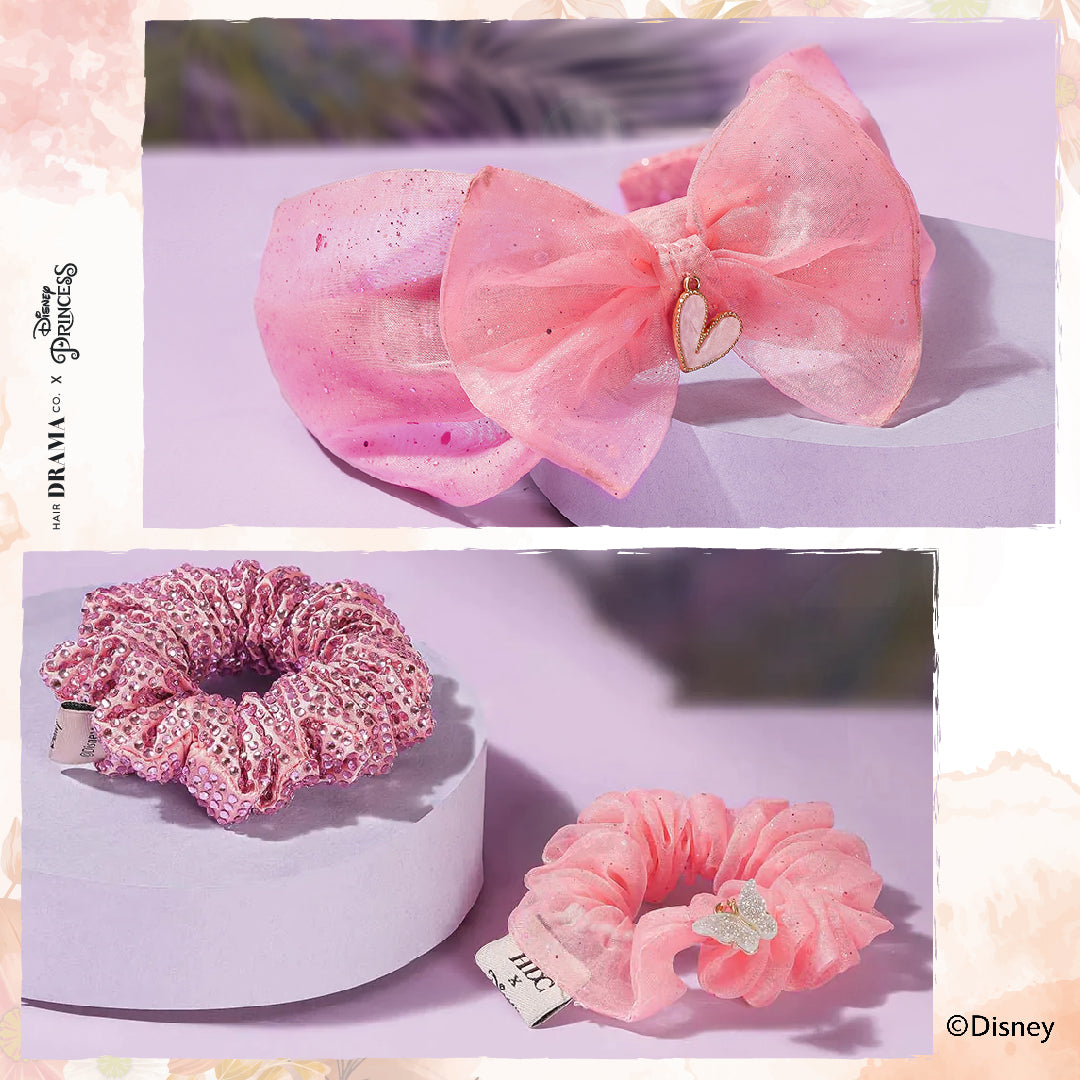 This Bundle contains our HDC x Disney Princess Kids Heart of Gold Shimmer & Crystals Scrunchies - Set of 2 & HDC X Disney Princess Kids Bow Headband. All of this comes in a Heart Shaped Hair Drama Co. signature...