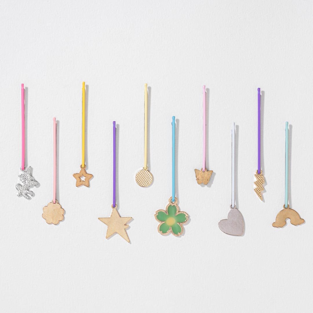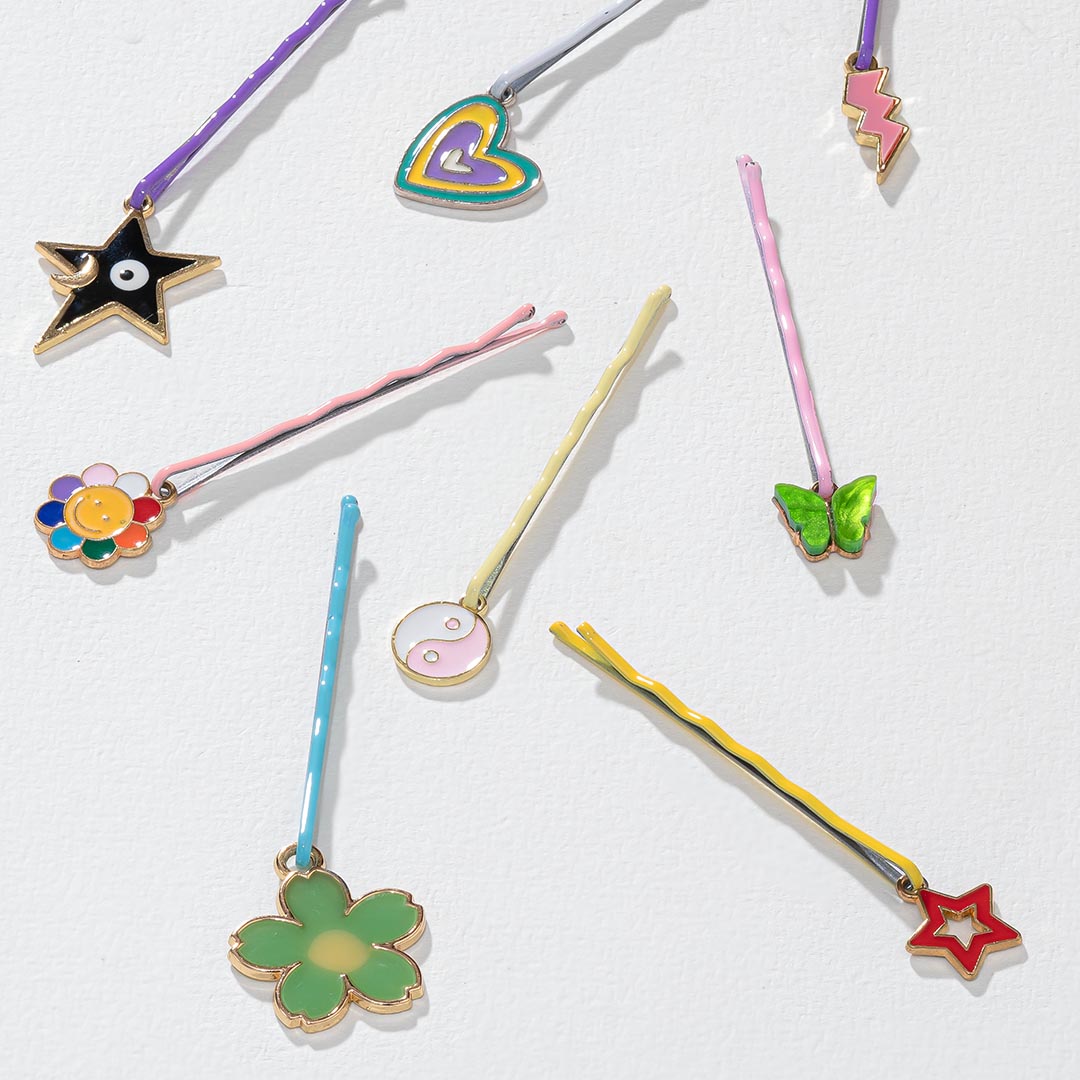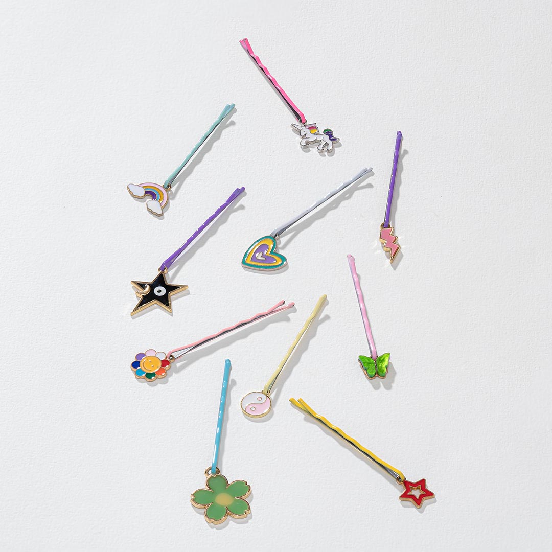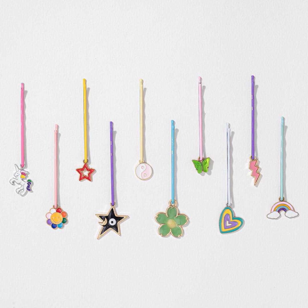 This set of 10 Charm-ed hair pins is your new go-to for everyday glam. Featuring an assortment of colorful finishes and fun charms — no two pins are exactly alike, making each set delightfully unique. From stars and hearts to butterflies and more, these charm hair clips add personality to any hairstyle in seconds.