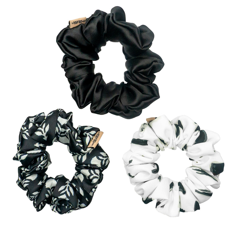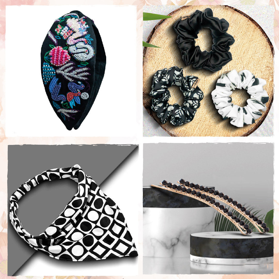 - This Bundle contains our Swan Knotted Headband - Black, Black Crystal Pin - Set Of 2, Classics Black & White Printed Satin Scrunchies - Set of 3 & Monochrome Headscarf Headband With Elastic .